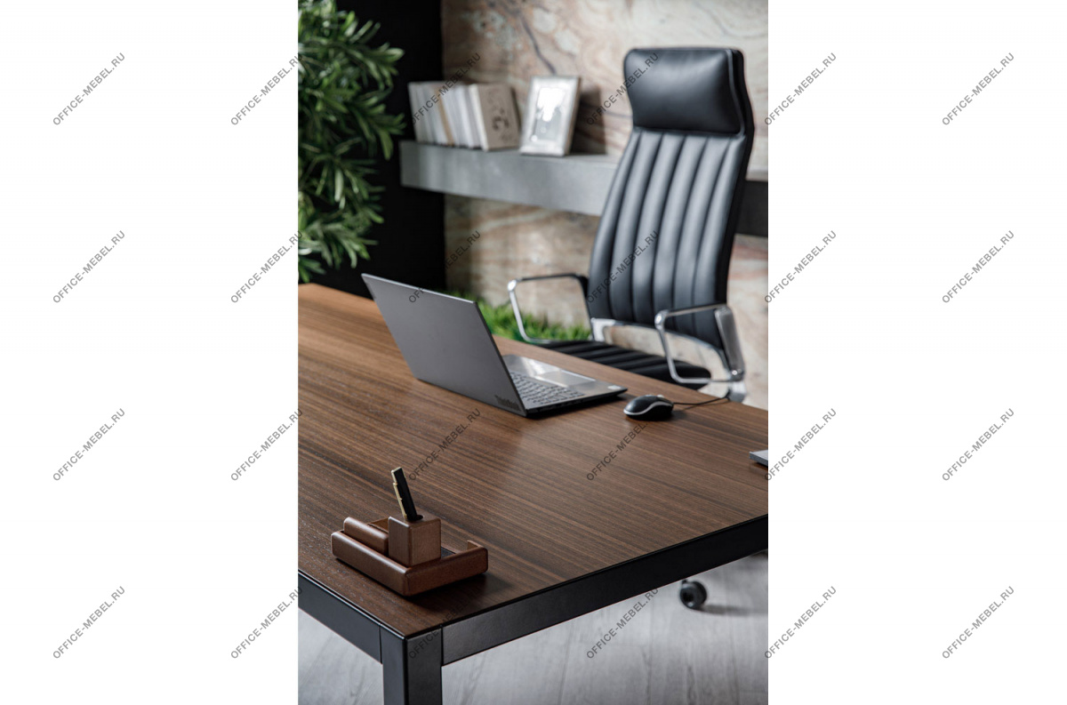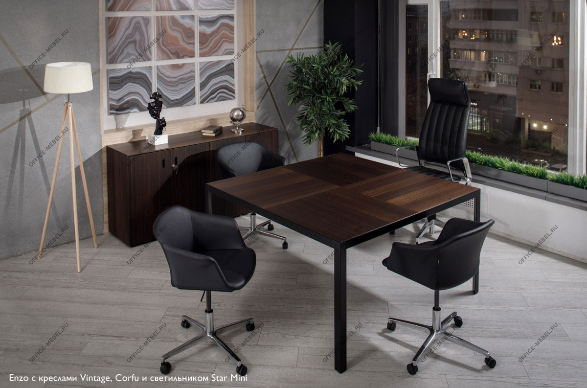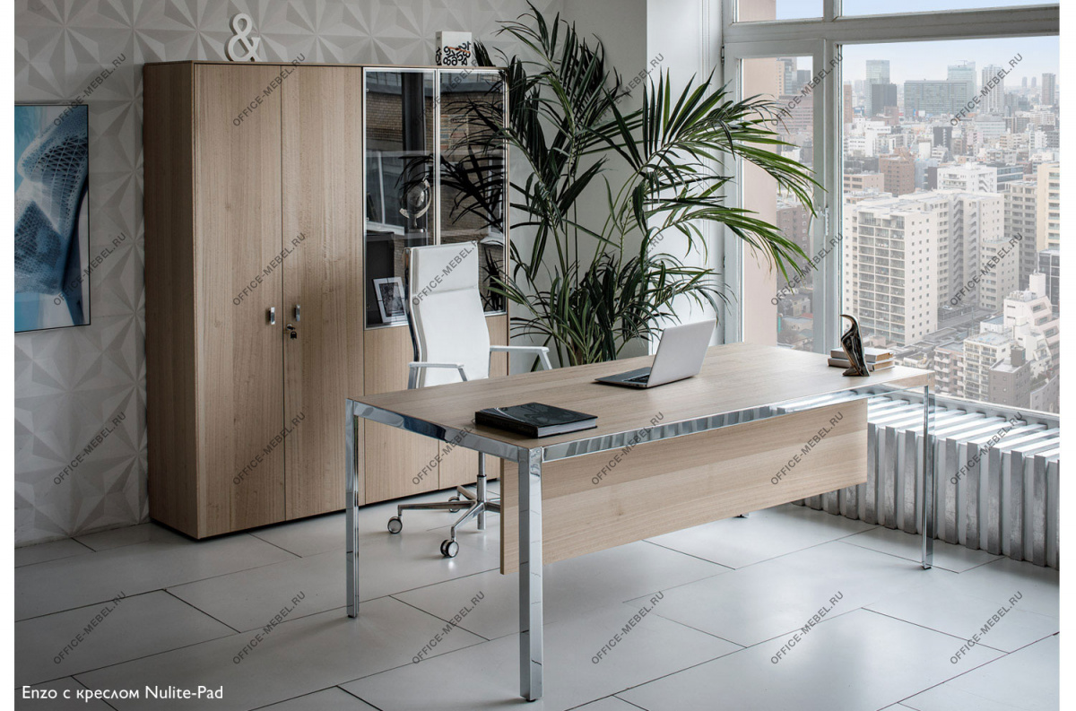 В основе концепции стола Enzo – минималистичная металлическая рама, в которую встроена столешница из шпонированного МДФ. Конструкция и опоры с треугольным сечением из металлического профиля обеспечивают максимальную устойчивость и прочность.