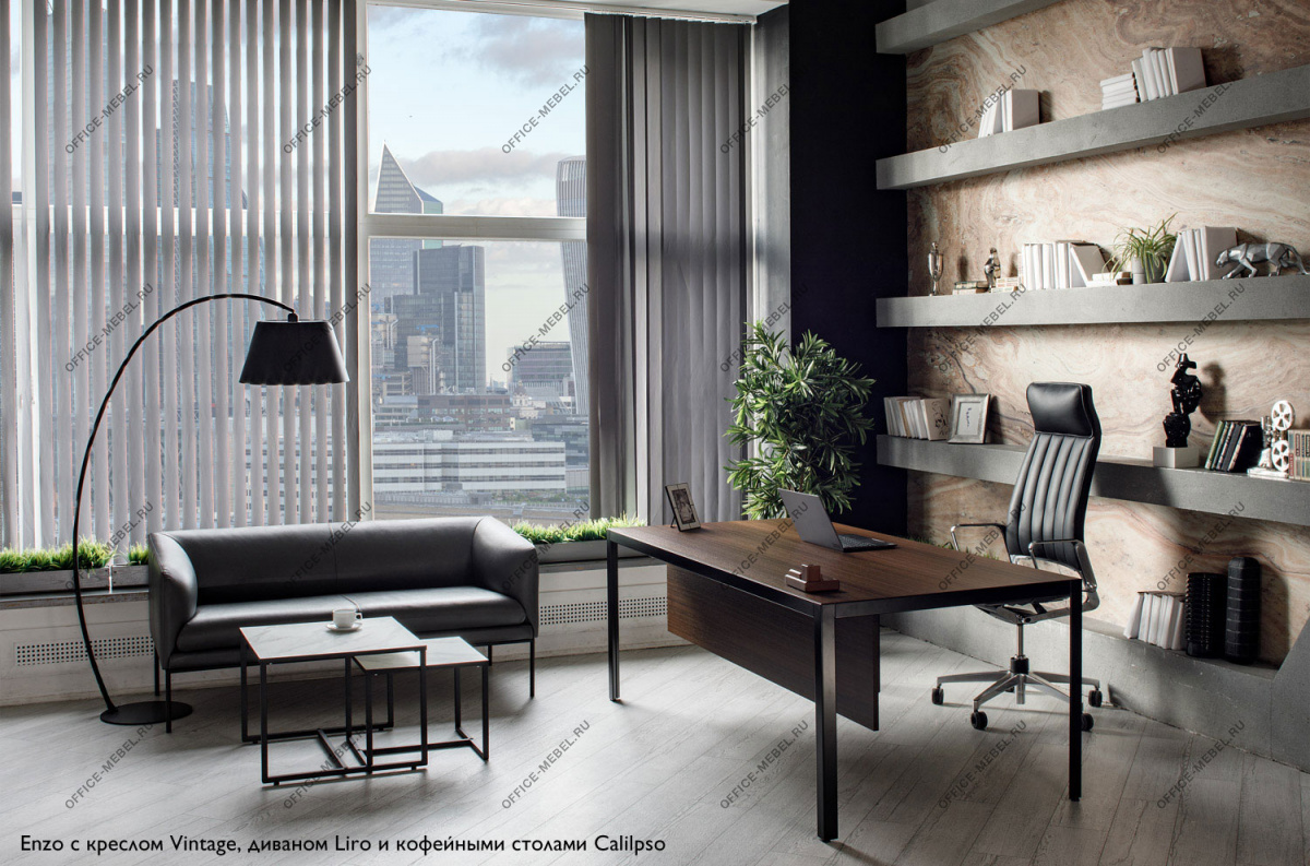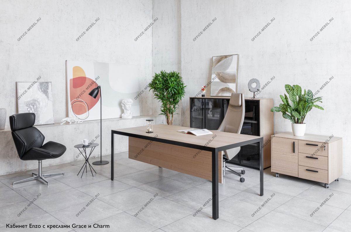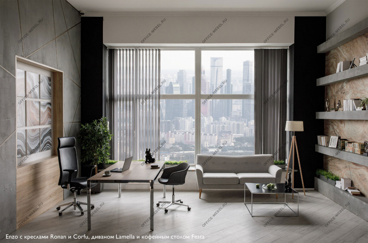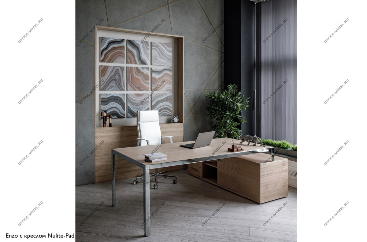 В основе концепции стола Enzo – минималистичная металлическая рама, в которую встроена столешница из шпонированного МДФ. Конструкция и опоры с треугольным сечением из металлического профиля обеспечивают максимальную устойчивость и прочность.