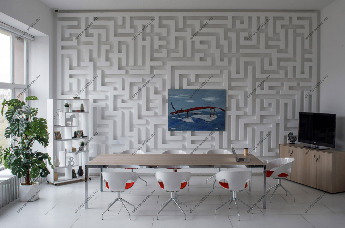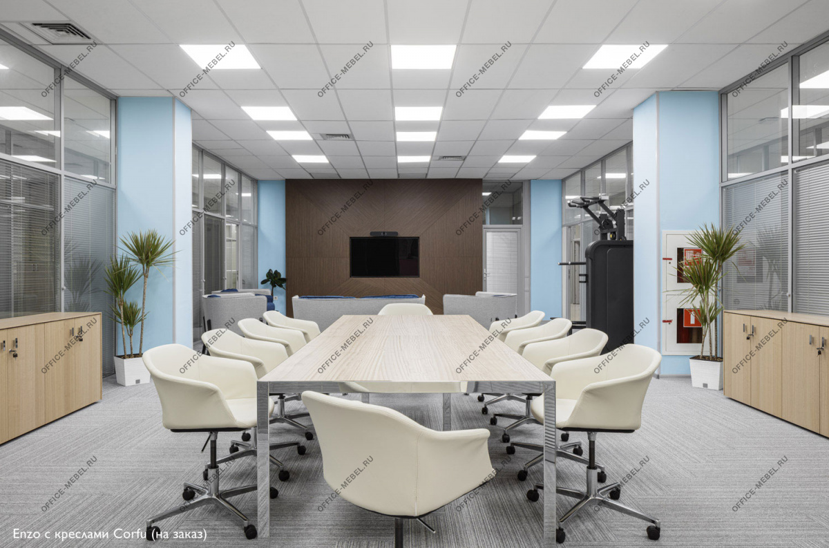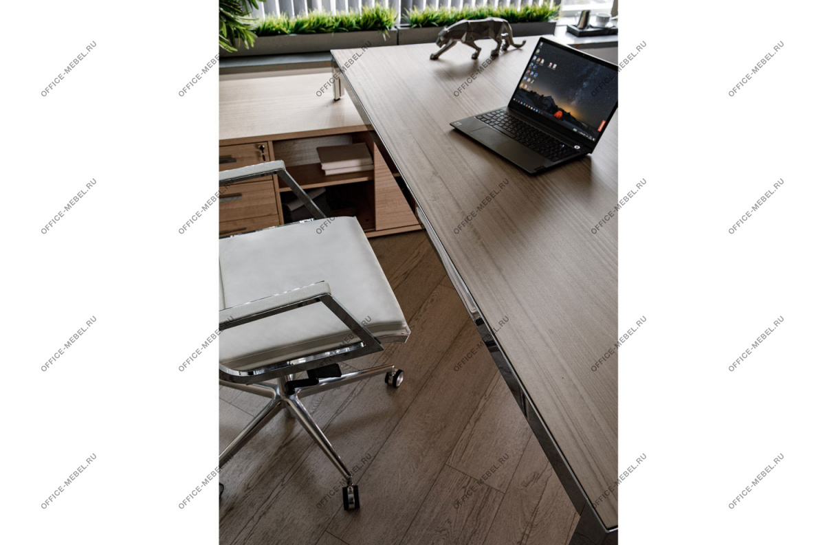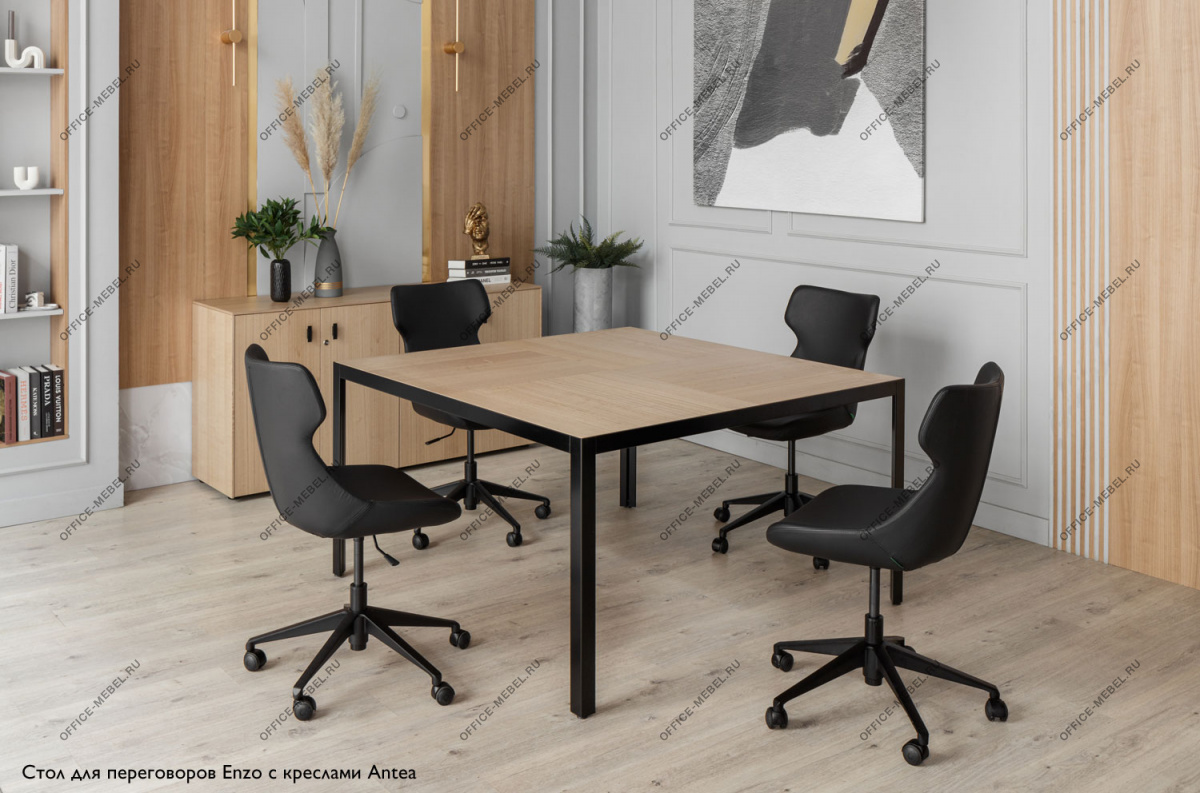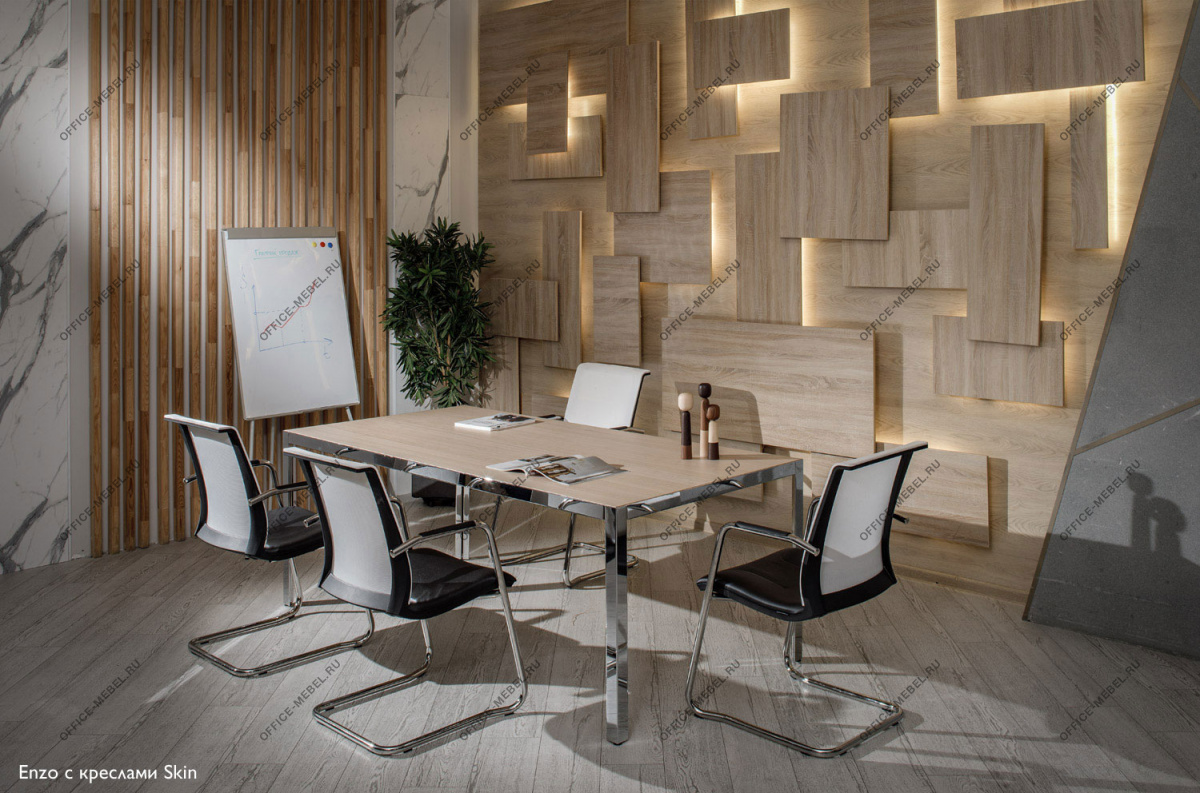 Квадратный переговорный стол с динамичным разнонаправленным шпоном призван стать центральным элементом и главным героем пространства.