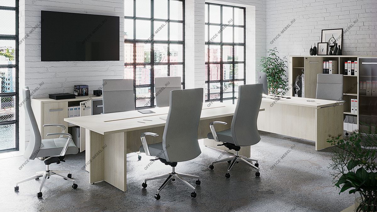 Столы. Столешницы и опоры толщиной 32 мм, выполнены из ЛДСП, кромка ПВХ 1 мм. Царга - ЛДСП 18 мм, кромка ПВХ 0,4 мм. Все столы оснащены регулируемыми опорами. Приставные столы крепятся к рабочим столам с помощью соединительной Z-образной пластины. В соединении используется трехкомпонентная эксцентриковая стяжка с декоративной заглушкой.