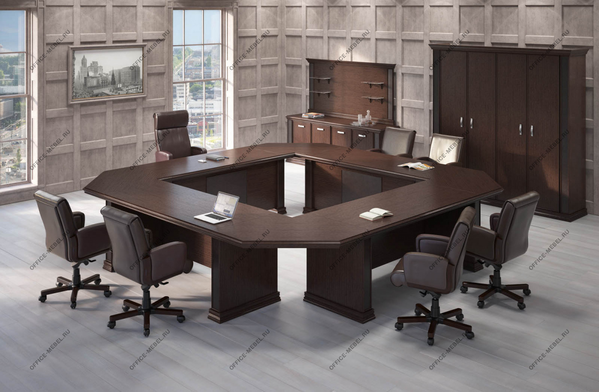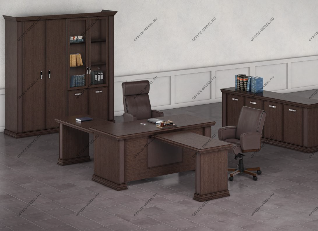 Стол руководителя выполнен с фронталью, декорированной вставкой под кожу с крокодиловым тиснением, которая обрамлена тонким профилем из МДФ, сочетающимся с бордюром и цоколем. Опора стола выполнена с цоколем, а её торцы декорированы вставкой под кожу.