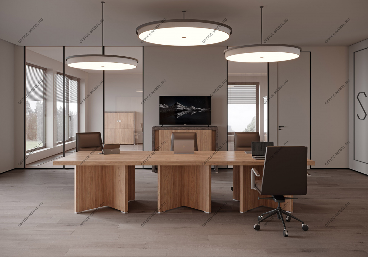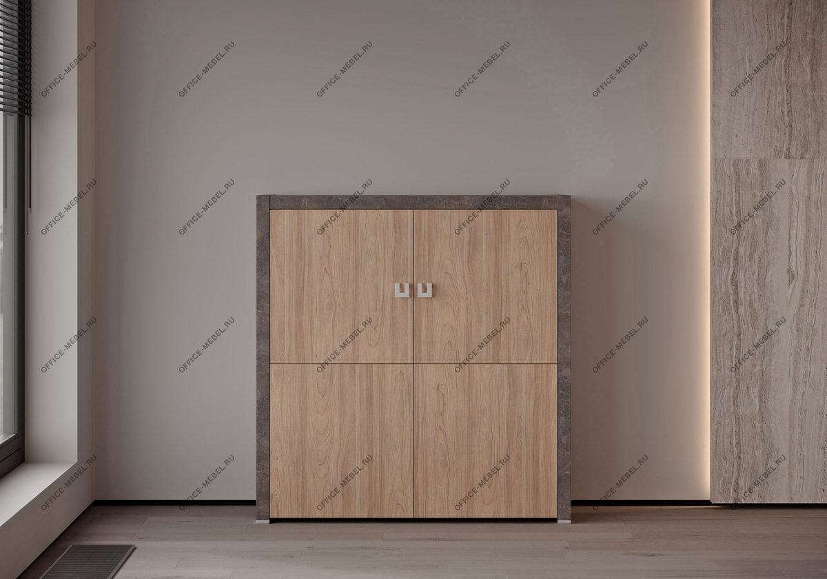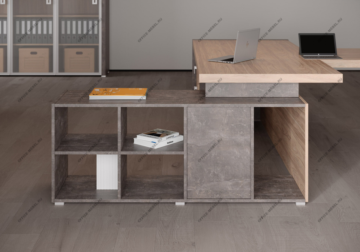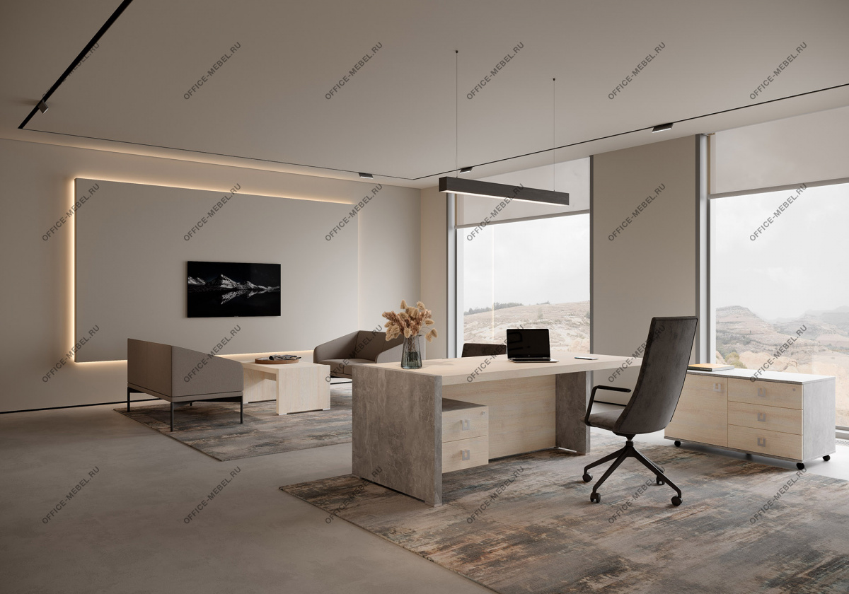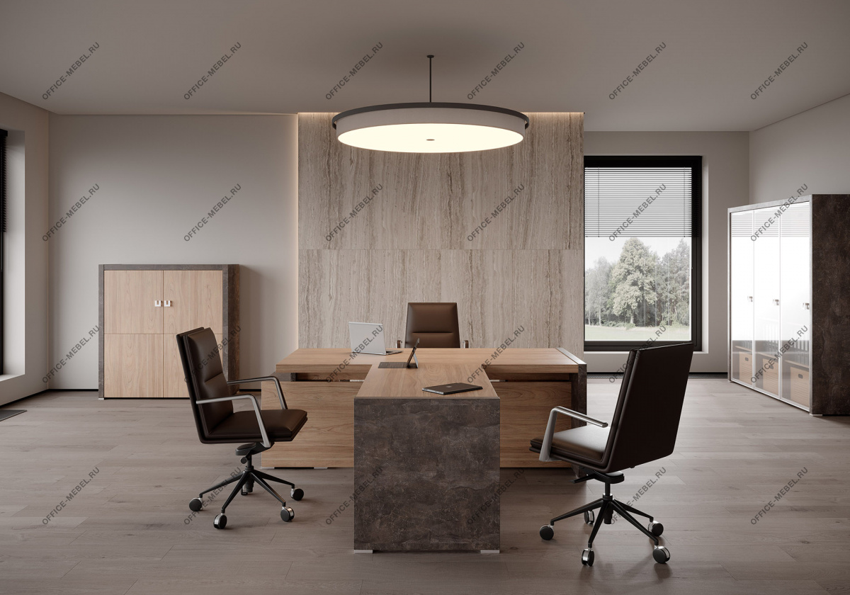 Вариант 1: Вяз (натуральный оттенок дерева) в сочетании с темным бетоном — создает контрастный, индустриальный вид, идеальный для динамичных офисов.