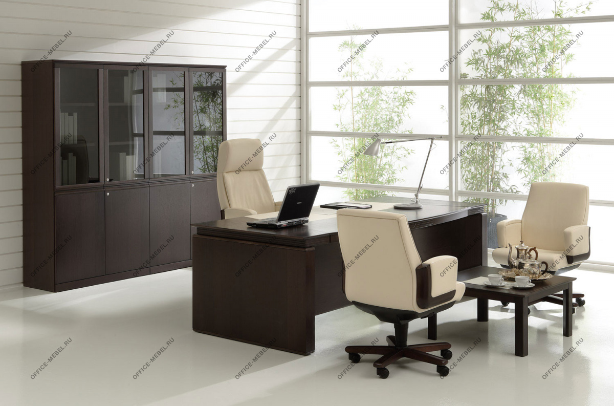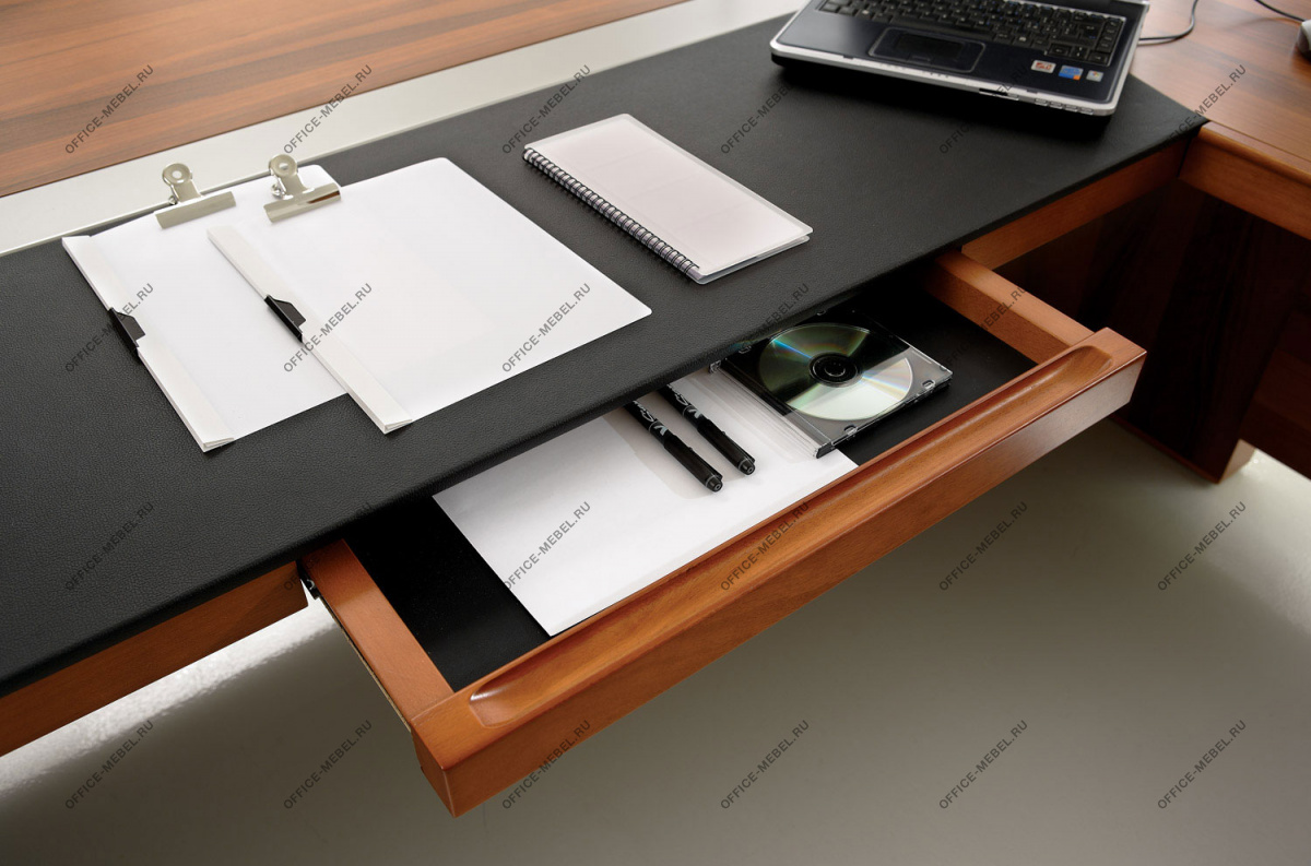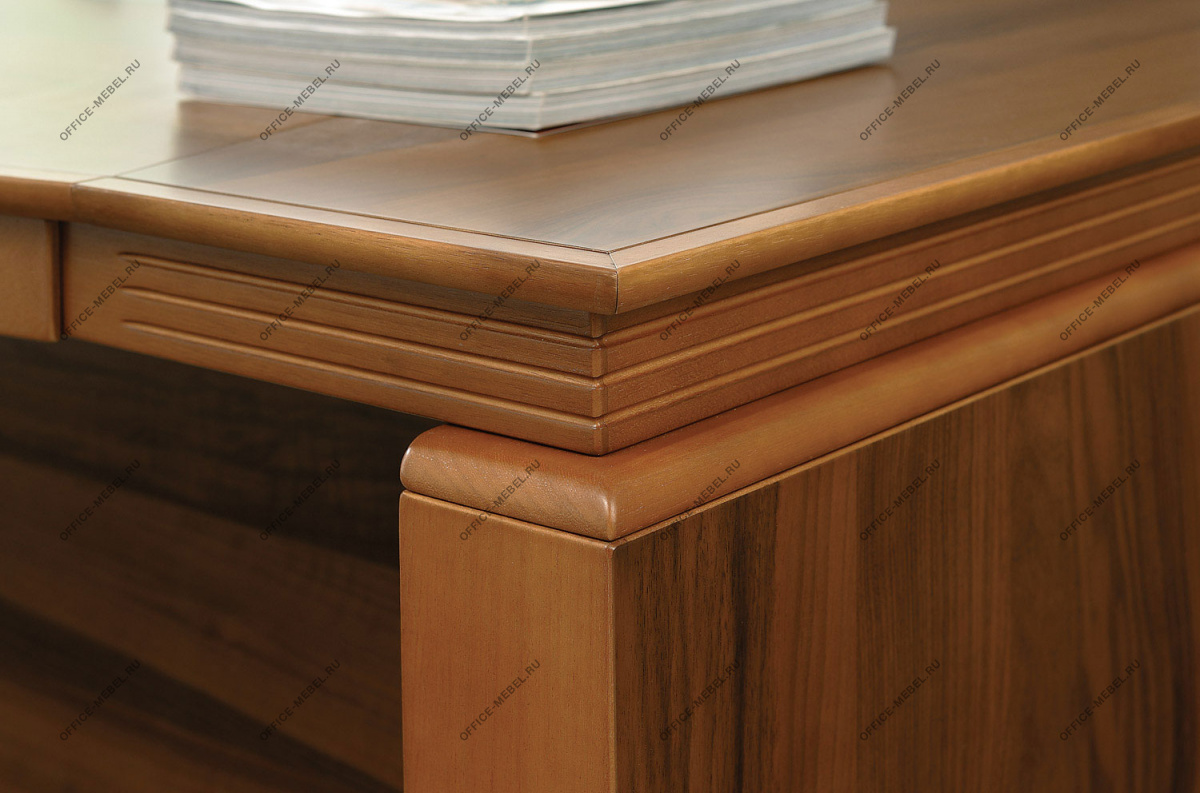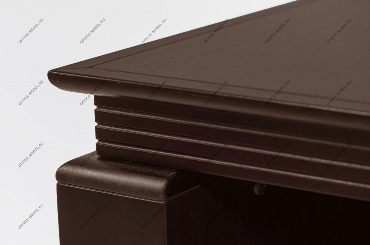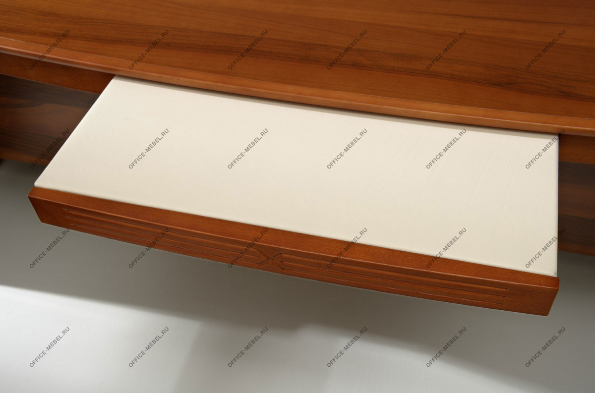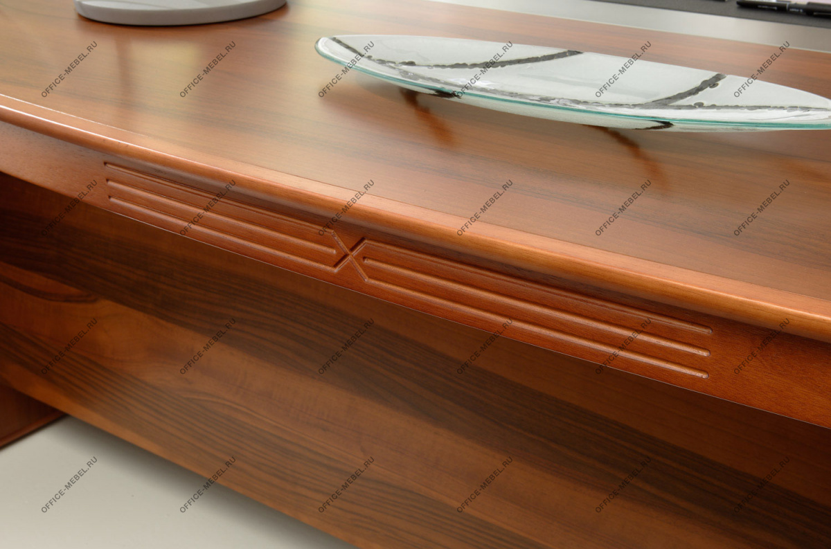 Резная кромка письменного стола — массив ценной породы дерева Кото. У столов длиной 230 см часть столешницы, выполненная из тамбурата, оснащена выдвижным ящиком для канцелярских принадлежностей. Опоры выполнены из тамбурата толщиной 90 мм с завершающими панелями из массива дерева толщиной 19 мм с закруглением радиусом 15 мм.