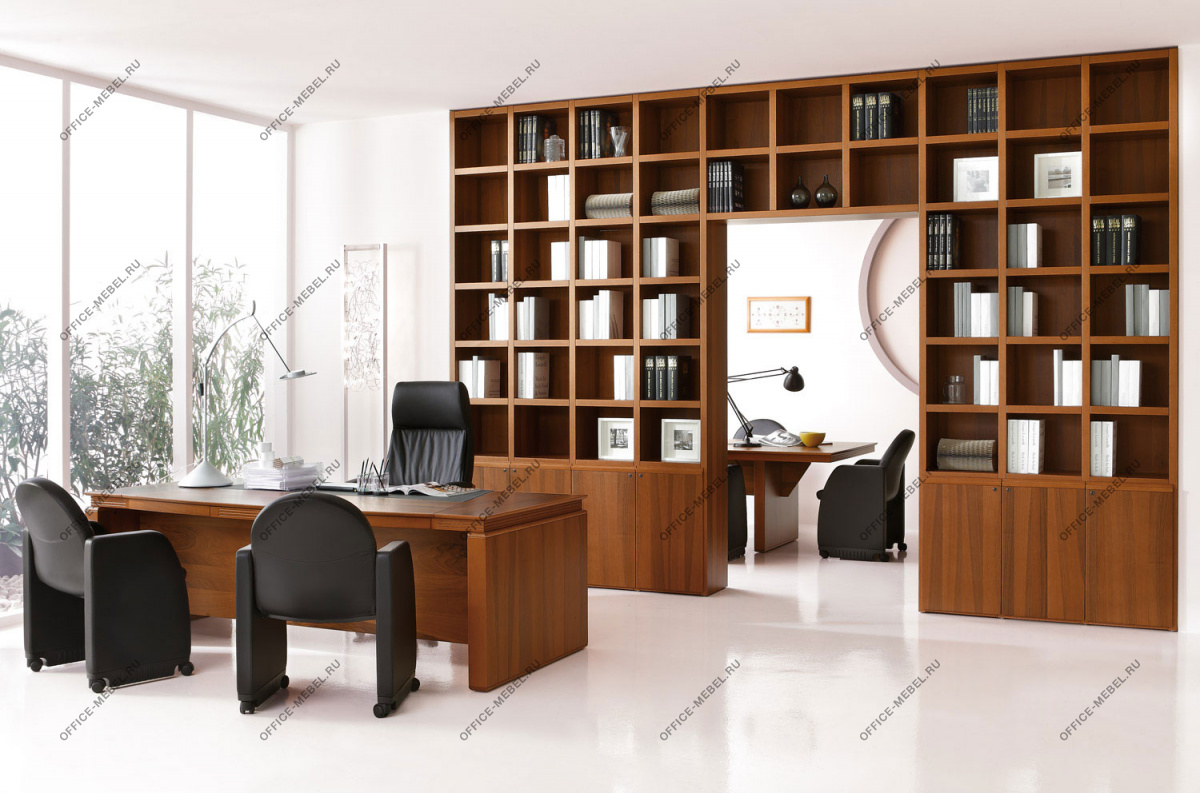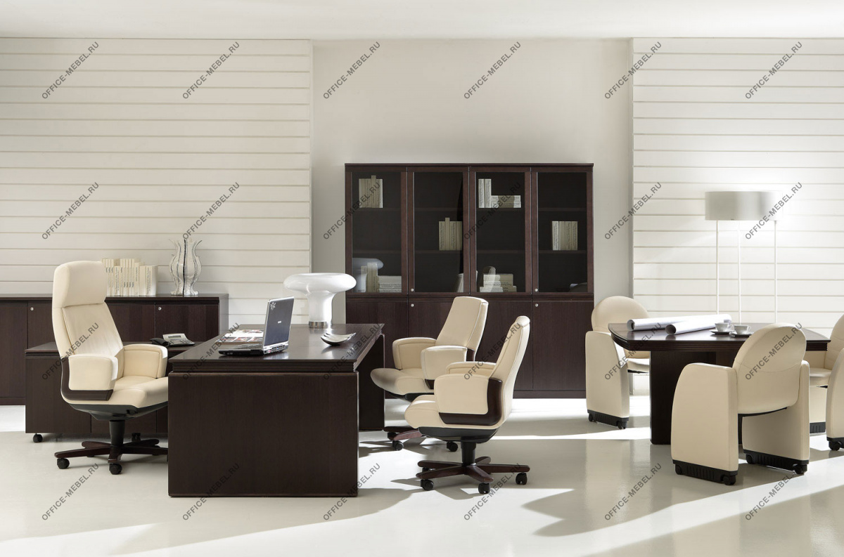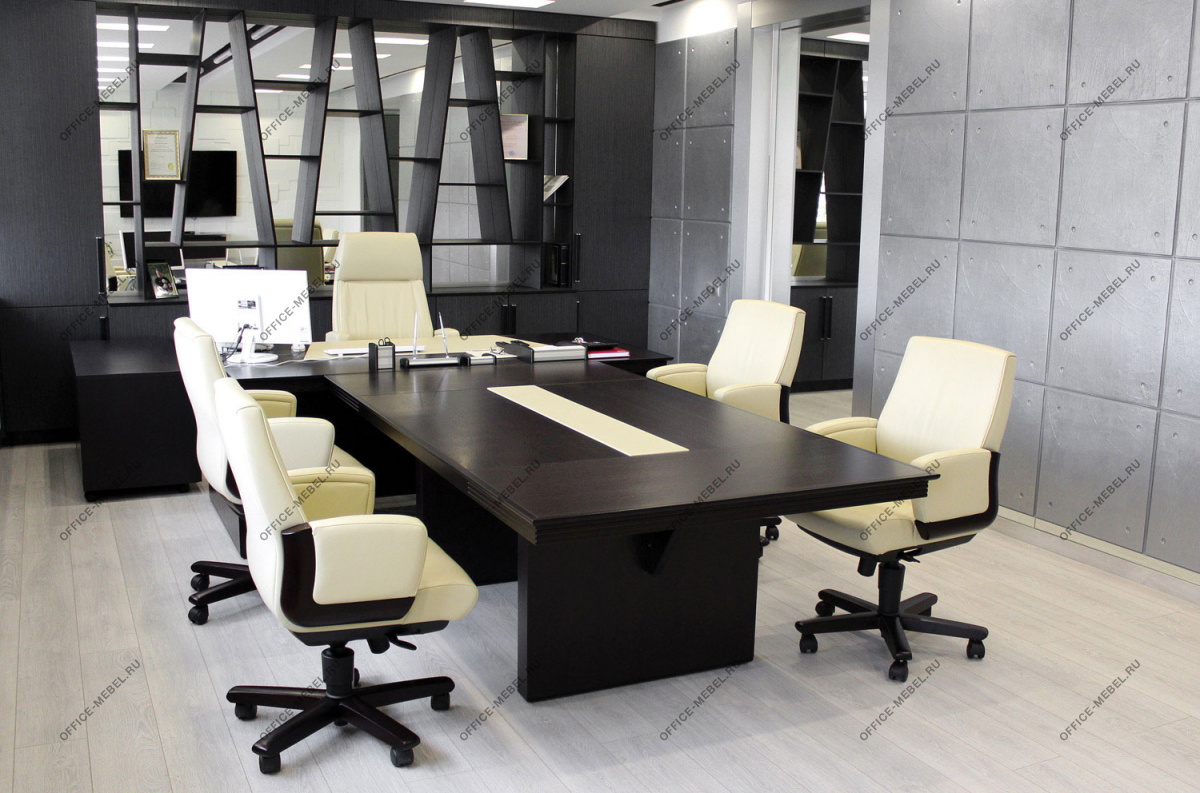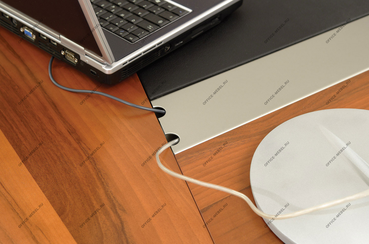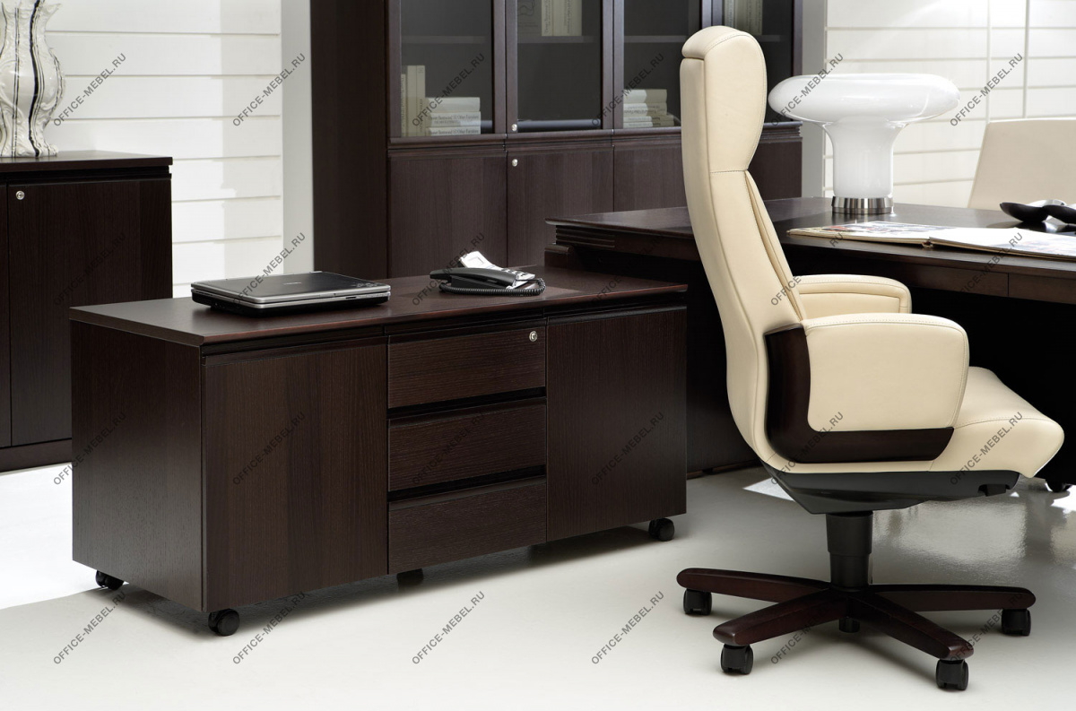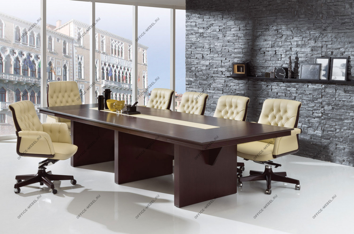 Резная кромка письменного стола — массив ценной породы дерева Кото. У столов длиной 230 см часть столешницы, выполненная из тамбурата, оснащена выдвижным ящиком для канцелярских принадлежностей. Опоры выполнены из тамбурата толщиной 90 мм с завершающими панелями из массива дерева толщиной 19 мм с закруглением радиусом 15 мм.