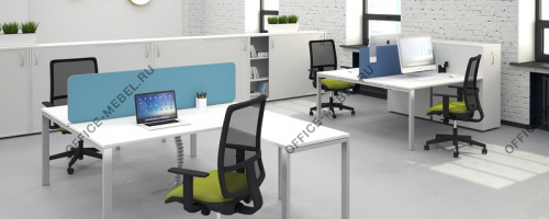 - Бенч-системы на металлокаркасе сечения 60*30 мм и 40*40 мм в трех цветовых решениях: белый (базовый), серый, антрацит. Углубленные траверсы на 150 мм и проставки дают возможность не только удобного монтажа дополнительных элементов (экраны), но и увеличивают степень комфорта сидящего.